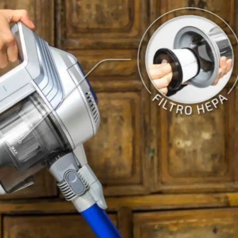 - Filtro HEPA capaz de retener polvo y alérgenos y expulsar un aire más limpio y saludable que el que entra por el aspirador.