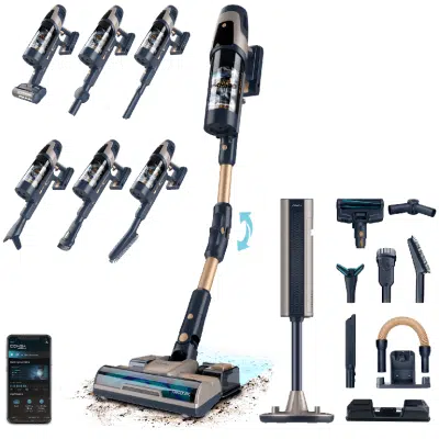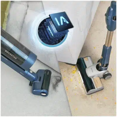 - Potencia automática según tus movimientos, nivel de suciedad y tipo de superficie. Inteligencia Artificial: gestión precisa de la potencia para cada situación de limpieza, que optimiza el consumo de la batería para limpiar en profundidad de forma eficiente.