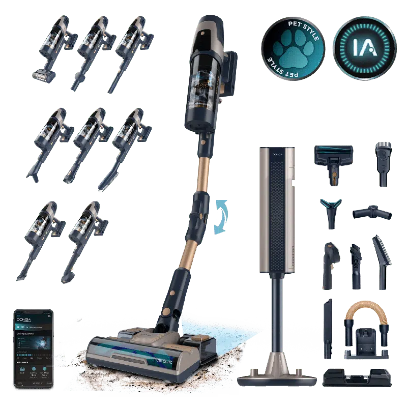 RZ90 AI AquaPet Flex Connected Aspirador escoba sin cables con base de autovaciado. 310 AW y 850 W. Tubo flexible. Inteligencia Artificial y contador de partículas. APP. Cepillo de animales y accesorio WaterTank de fregado.