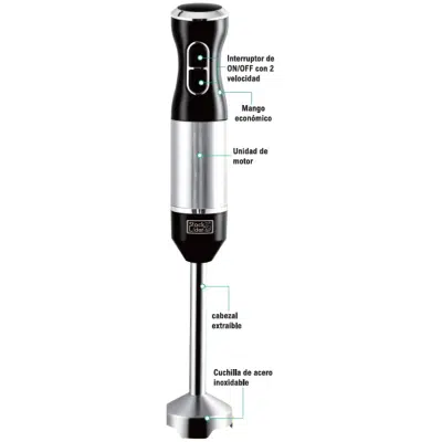 Equipada con motor de dos velocidades, esta batidora se adapta a cada tipo de preparación. Usa la velocidad baja para mezclas más delicadas como salsas o mayonesas, y la velocidad alta para triturar frutas, verduras o ingredientes más duros. Su interruptor de encendido ON/OFF es cómodo y de fácil acceso, permitiendo un manejo seguro y eficaz.