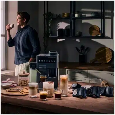 - Apta para café en grano, Dolce Gusto, Nespresso y K-fee. Cafetera multicápsulas con molinillo.