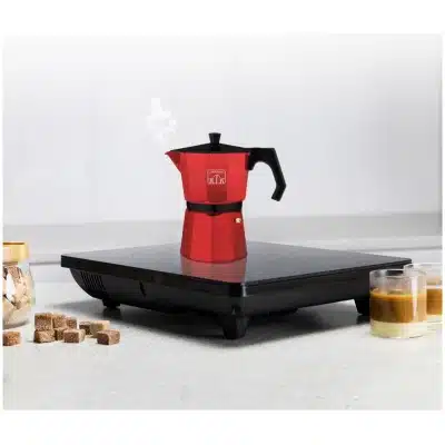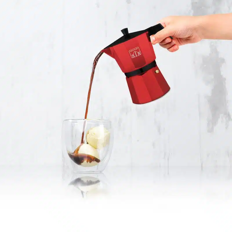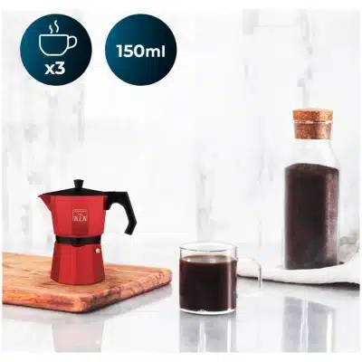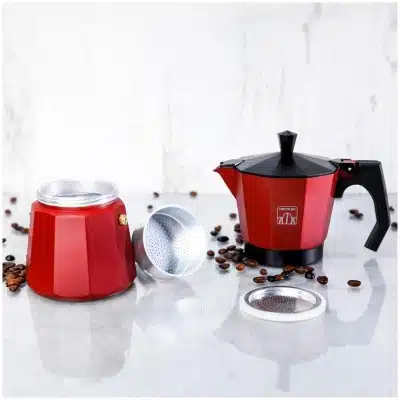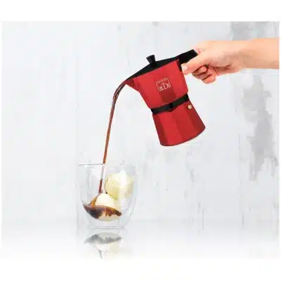 • Cafetera italiana fabricada en aluminio de color rojo, para hacer el café con el mejor cuerpo y aroma.