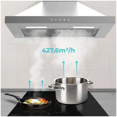 - Ambiente libre de humos y olores. Con una potencia de succión de 427,6m³/h, esta campana asegura la eliminación eficaz de humos y olores, proporcionando una cocina limpia y fresca.