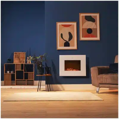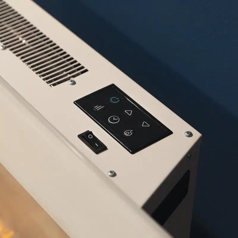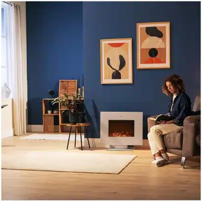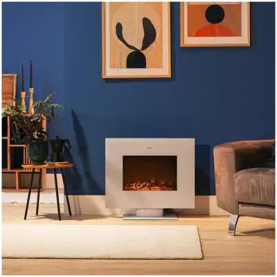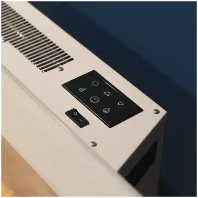 ReadyWarm 2710 Design Flames White Chimenea eléctrica decorativa de 26” con máxima potencia de 2000 W. Dos intensidades 1000 W y 2000 W. Panel plano de cristal templado. Llama independiente y ajustable. Temporizador semanal. Sensor de puerta abierta.