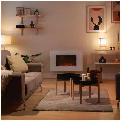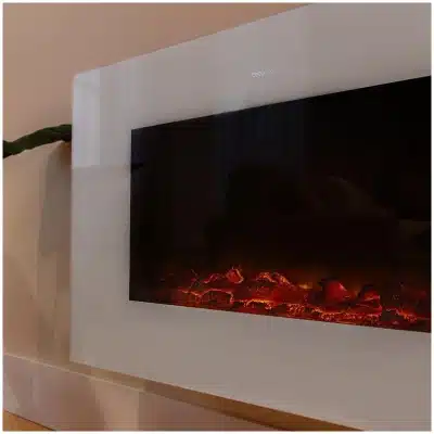 ReadyWarm 3590 Flames Connected White Chimenea eléctrica decorativa de 35” con máxima potencia de 2000 W. Dos intensidades 1000 W y 2000 W. Control por Wi-Fi. Mando a distancia. Panel plano de cristal templado. Llama independiente y ajustable. Temporizador semanal. Sensor de puerta abierta.