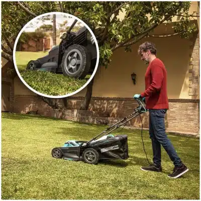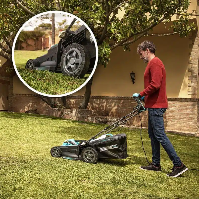 Terrenator 460 Flex Z Auto Cortacésped eléctrico con cable con 2000W. Ancho de corte 46cm. Propulsión automática. Cambio de altura sistema Z-Tech. 4in1 con mulching. Ruedas traseras XL. Seguidad con tecnología BeltDrive.