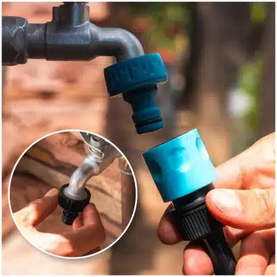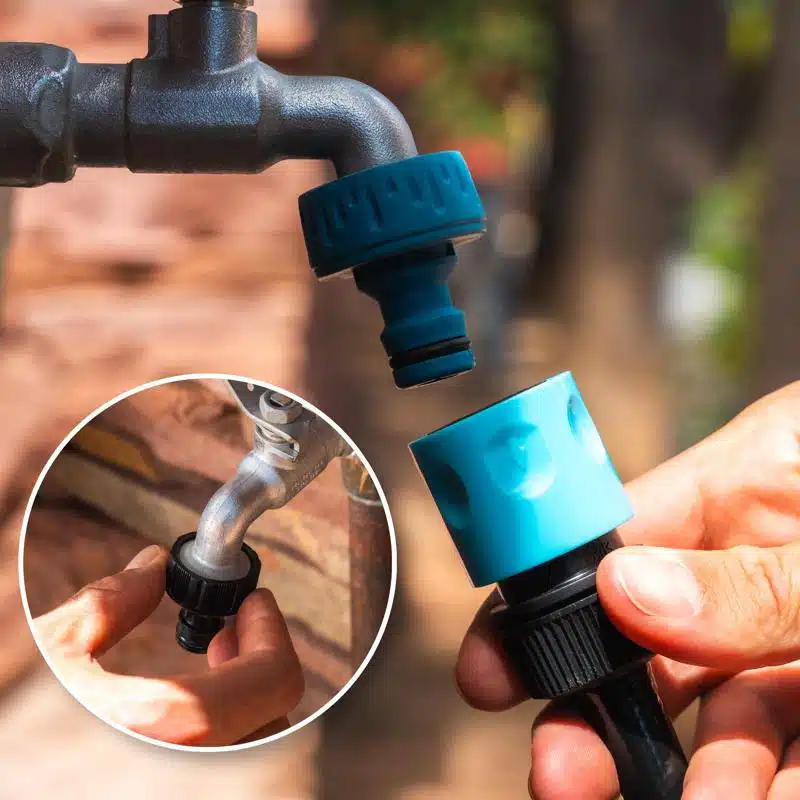 - Compatible con cualquier sistema de riego. Conexión universal 3 en 1 con conector rápido Click, rosca pequeña de 1/2″ y rosca grande de 3/4’’.