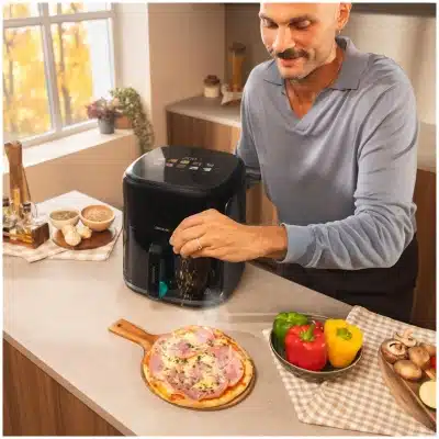 - Freidora de aire, grill y plancha. Diseño 3 en 1 que permite cocinar carnes con el punto perfecto, pizzas como masas esponjosas y todo tipo de recetas a tu gusto de la forma más saludable.