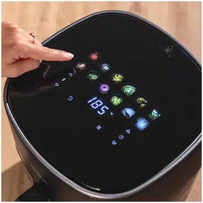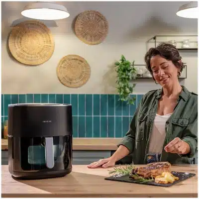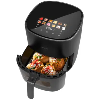 - Platos saludables con solo una cucharada de aceite. Su potencia de 2200 W permite cocinar recetas con una cucharada de aceite, reduciendo la cantidad de grasas en tus preparaciones sin sacrificar su sabor ni su textura.
