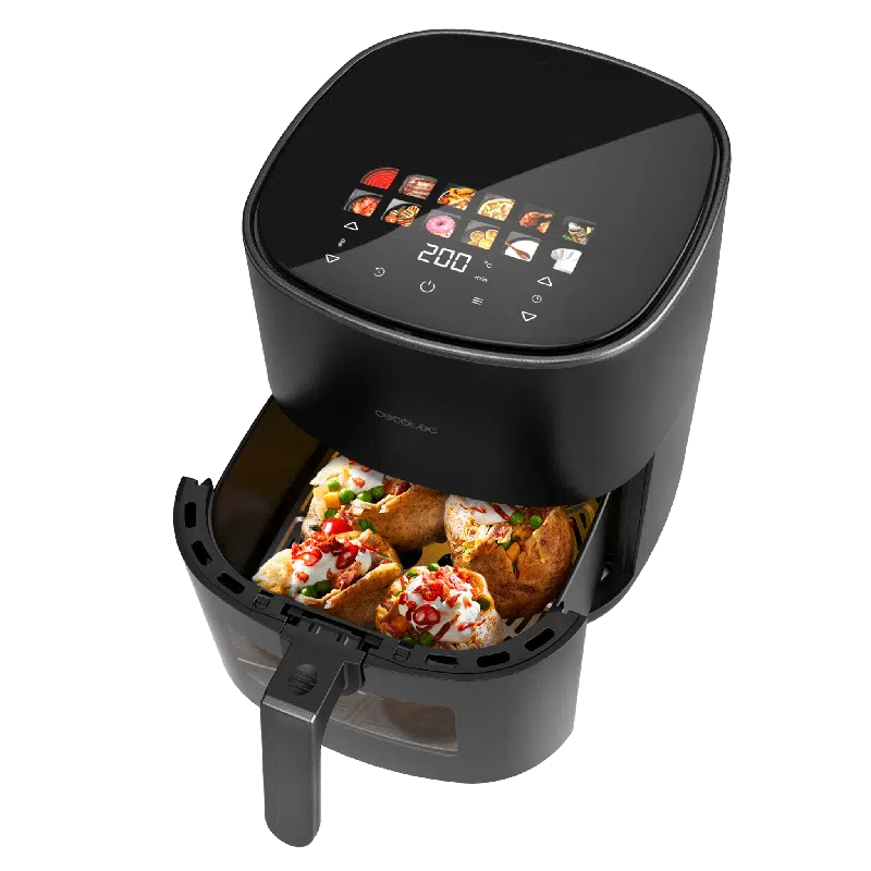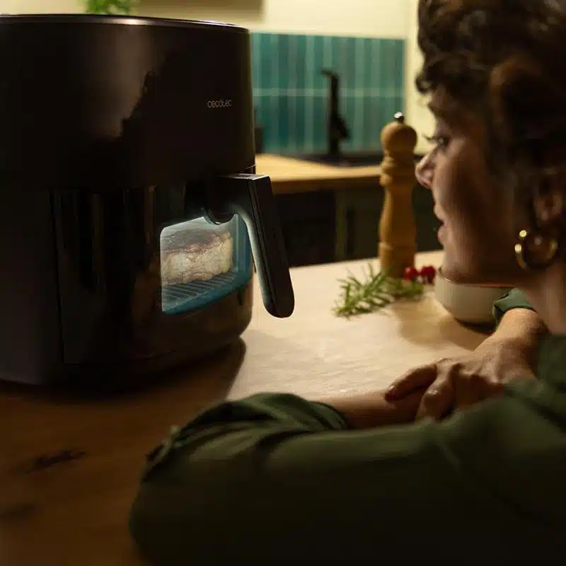 - Controla todo el proceso sin perder calor. La freidora permite controlar el progreso de tus elaboraciones sin necesidad de abrir la cubeta a través de su ventana de visualización.