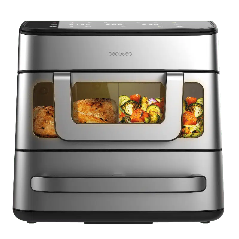 - Freidora de aire de 9 L con ventana. Cocina recetas saludables con aire y controla el punto de cocción sin abrir la cubeta gracias a su diseño con ventana, que permite cocinar de forma cómoda y sin pérdidas de calor.