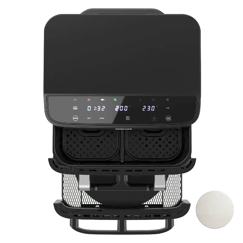- Freidora de aire y horno. Cocina con aire, hornea o cocina dos recetas a la vez con cocciones diferentes gracias a su diseño 2 en 1, que ofrece una gran versatilidad sin ocupar más espacio en la cocina.