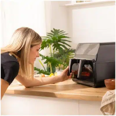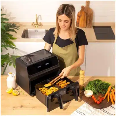 - Cocina dos platos: freidora dietética con doble cestillo y temperatura dual para cocinar dos platos diferentes a la vez.