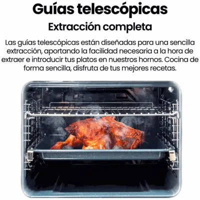 Su sistema de calor uniforme asegura una cocción óptima en todo el interior del horno, mejorando la textura y el sabor de los alimentos. El diseño moderno y funcional facilita su integración en cualquier tipo de cocina, mientras que sus mandos intuitivos permiten un control sencillo y preciso de la temperatura y del tiempo de cocinado.