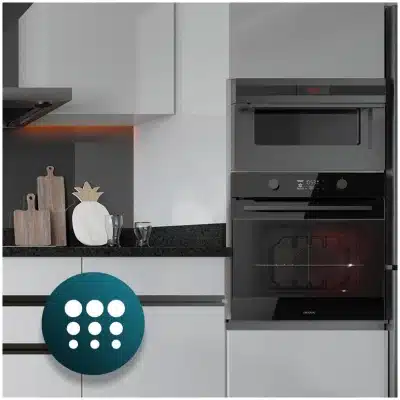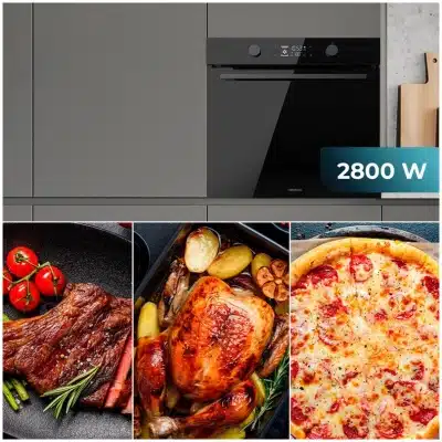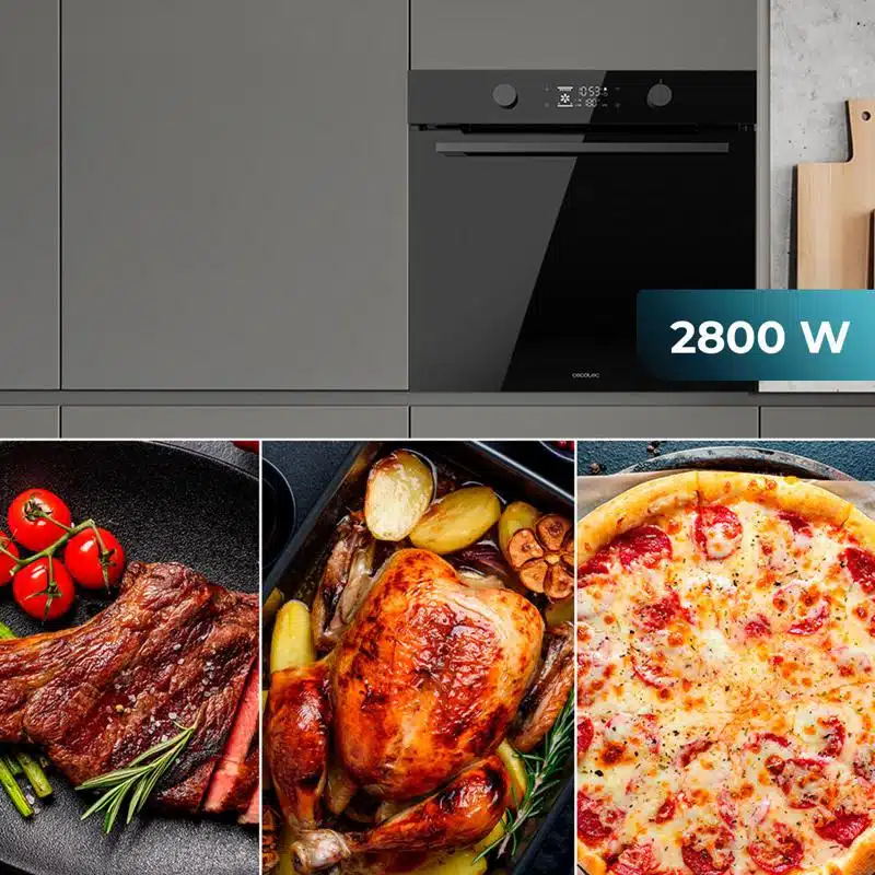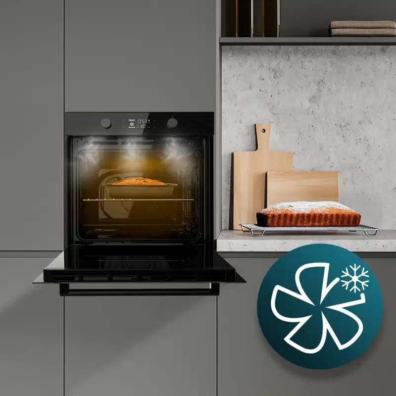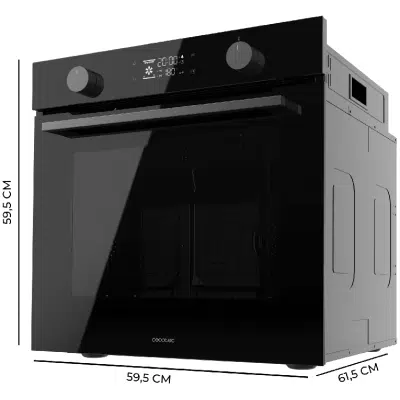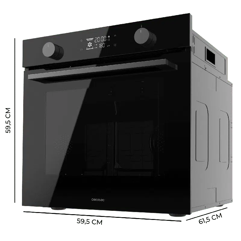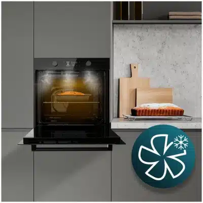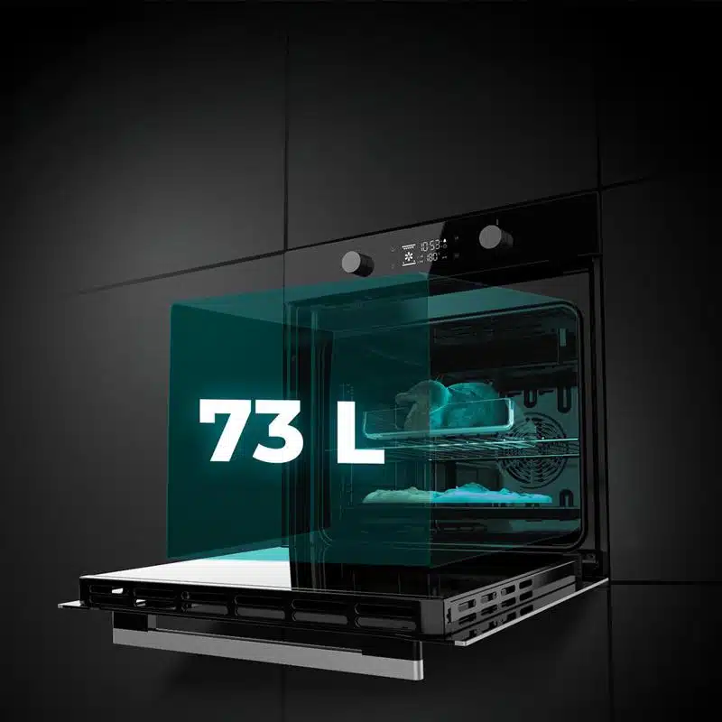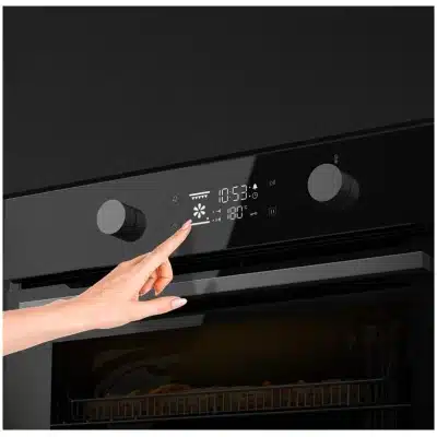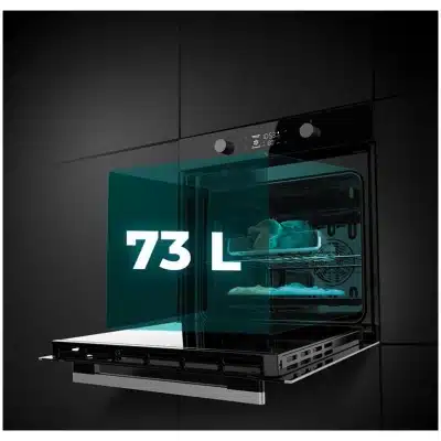 El horno cuenta con un panel de control táctil con display digital, intuitivo y fácil de usar, que permite seleccionar funciones, tiempos y temperaturas de forma precisa. Además, incorpora un sistema de ventilación Cooling Fan, que mantiene una temperatura segura en el exterior del horno y protege los muebles de la cocina.