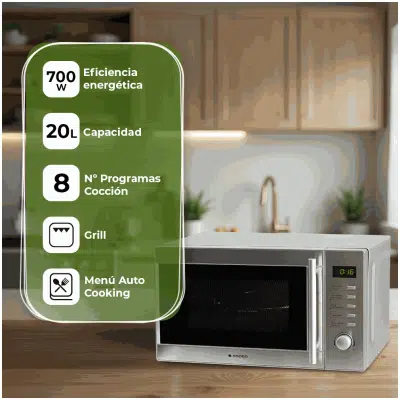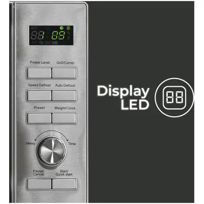 Estética inox con puerta de cristal negro y abertura con tirador. Cavidad de acero inoxidable con iluminación LED y base cerámica, sin plato de cristal. Sistema de control eléctronico con Display LED y temporizador digital. Ofrece 6 niveles de potencia, Grill, 2 opciones de cocina combinada y distintas funciones para obtener el mayor rendimiento y facilitar el proceso de cocción.