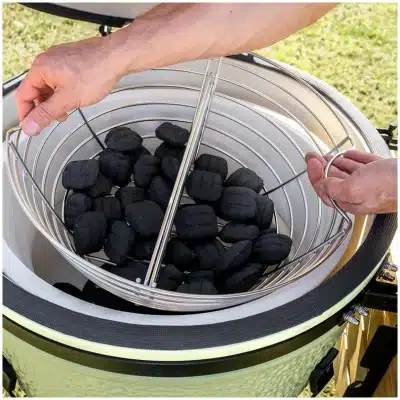 - Asegura un fuego uniforme y duradero. Canasta de carbón: facilita la distribución del carbón para una cocción perfecta.