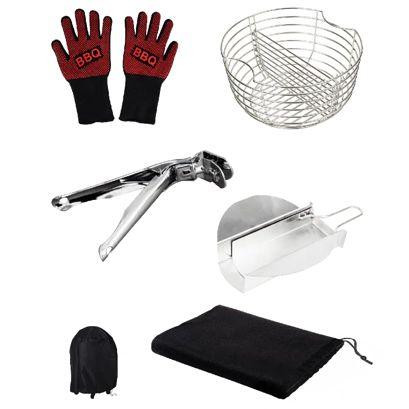 DragonPack 4600 L Pack de accesorios para barbacoa kamado que incluye pinzas, cubierta protectora, recolector de cenizas, canasta para carbón y guantes.