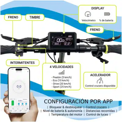 También cuenta con conexión Bluetooth, podrás vincular tu dispositivo iOS o Android utilizando la App Zwheel y personalizar tu patinete según tus preferencias.