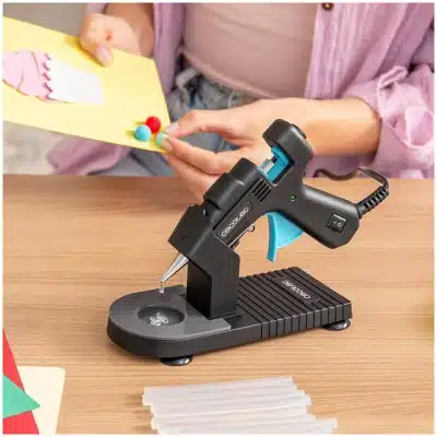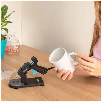 - Máxima estabilidad y seguridad. Pistola de silicona con base protectora para mantener una posición estable que evita quemaduras y protega la mesa, y asà trabajar de forma totalmente segura.
