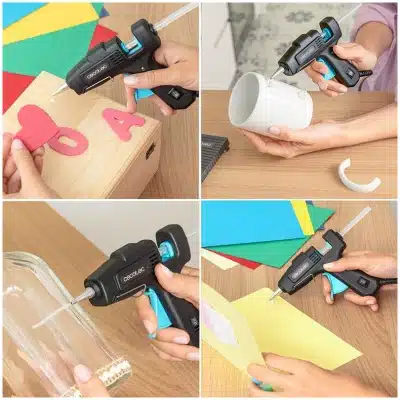 - Ideal para todo tipo de materiales. Utiliza la pistola en cualquier situación, ya que su uso es adecuado para pegar metales, madera, vidrio, tejidos, plásticos, cerámica, etc.