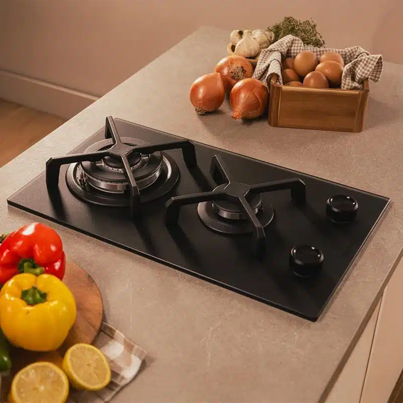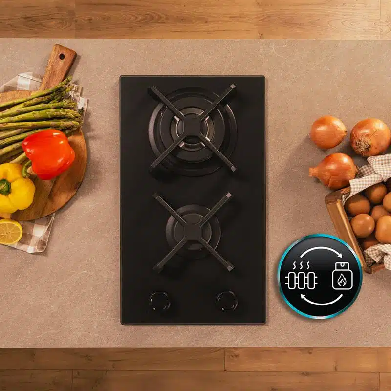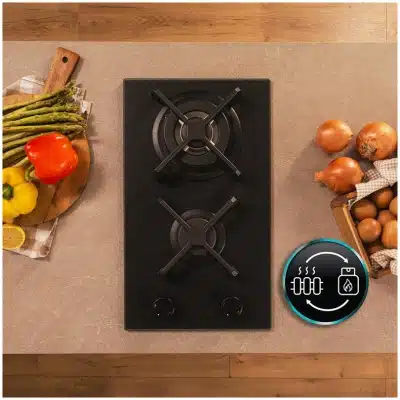 Bolero Squad G 2400S Nano Glass – Placa de gas de 2 Fuegos, 5,2kW, Nano Glass, Parrillas de Hierro Fundido, Quemador WOK Triple Corona, Encendido Electrónico, Seguridad en Válvulas.