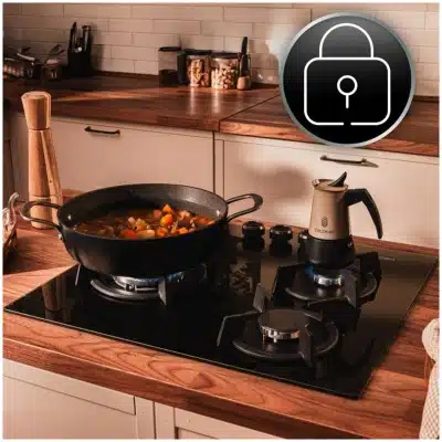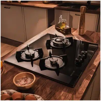 Bolero Squad G 3200S Glass Black Placa de gas, 3 fuegos, acabado en cristal negro, parrillas individuales de hierro fundido, potencia de 6,25kW, quemador WOK triple corona, encendido eléctrico, sistema de seguridad de las válvulas, para gas natural y accesorio de gas butano incluído.