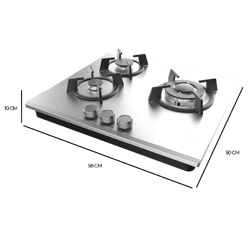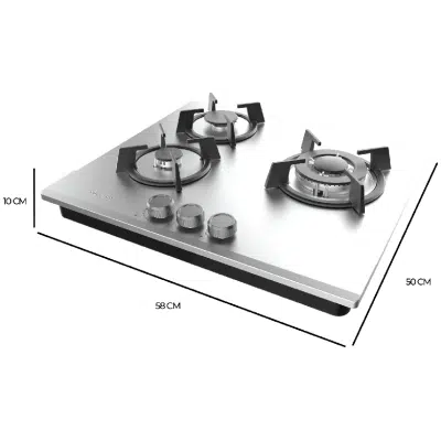 Bolero Squad G 3200S Inox Placa de gas, 3 fuegos, acabado en acero inoxidable, parrillas individuales de hierro fundido, potencia de 6,25kW, quemador WOK triple corona, encendido eléctrico, sistema de seguridad de las válvulas, para gas natural y accesorio para la conversión de gas incluído.