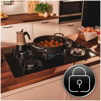 Bolero Squad G 5200S Glass Black Placa de gas, 5 fuegos, acabado en cristal negro, parrillas individuales de hierro fundido, potencia de 11kW, quemador WOK triple corona, encendido eléctrico, sistema de seguridad de las válvulas, para gas natural y accesorio para la conversión de gas incluído.