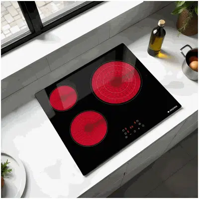 Placa de 3 zonas de cocción con potencia total de 5700 W. Una de las zonas es de triple corona, por lo que puede adaptarse a recipientes de mayor diámetro.