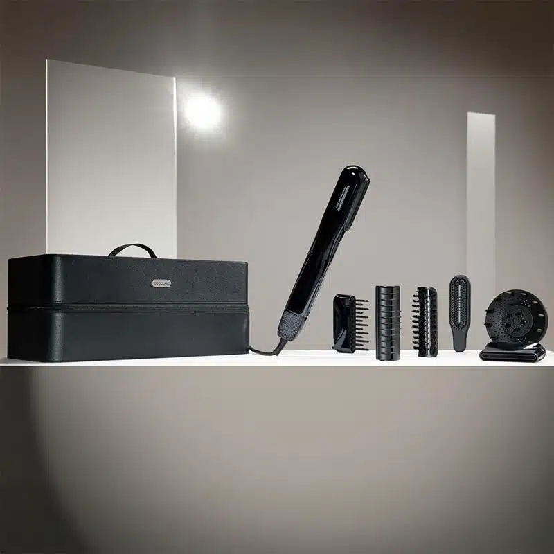 - Protege todos los accesorios, evitando el movimiento de los cabezales y asegurando que todo se mantenga en su lugar al abrirla. Haciendo más fácil su transporte y su almacenamiento para cuidarlo. Incluye un cepillo convencional adicional, ideal para el uso diario, asegurando que tu cabello esté siempre listo para cualquier ocasión. Además, también incluye un elegante estuche premium con separador en su interior.