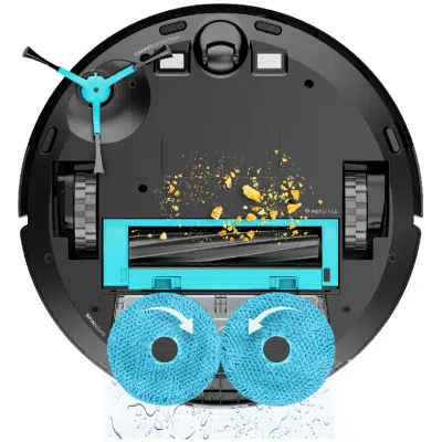 - Limpieza total de una pasada. Aspira, barre, friega y desincrusta con sus mopas Spin. Un equipo de limpieza completo que permite al robot hacer todo a la vez o por separado para ofrecer una limpieza a medida.