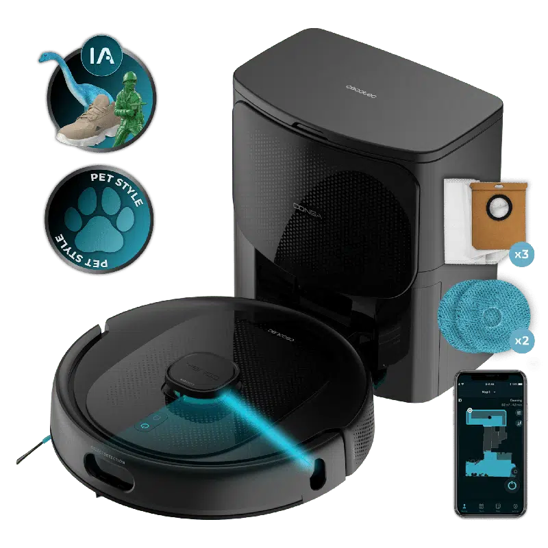 - Inteligencia Artificial. El robot limpia de forma inteligente gracias a su chip IA, que le permite esquivar objetos, incluso pequeños, para evitar riesgos y limpiar con la máxima precisión, incluso ante situaciones de desorden.