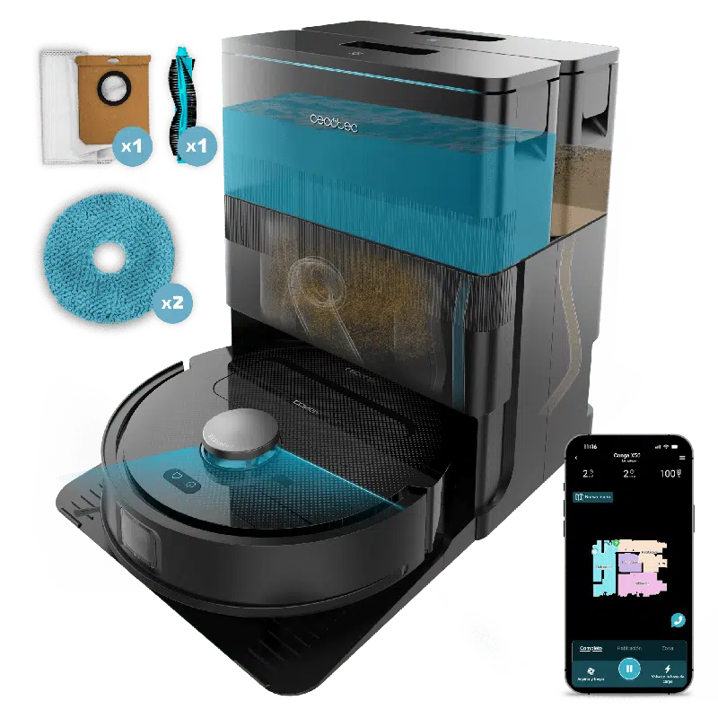 Conga X50 X-Treme Robot aspirador con Motor de succión 15000 Pa. Base 4 en 1, navegación láser, mopas spin, cepillo lateral. Base total de autovaciado de polvo, agua y limpieza de las mopas. App y conexión Bluetooth y WiFi para redes 2,4 GHz.