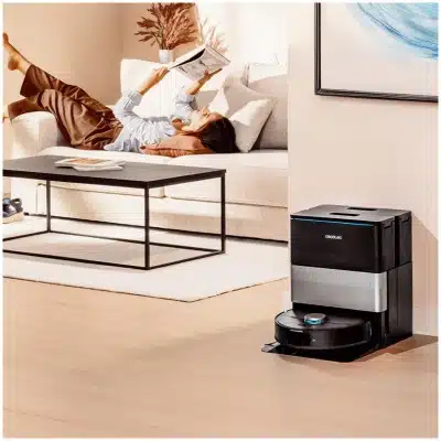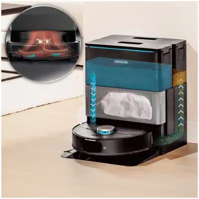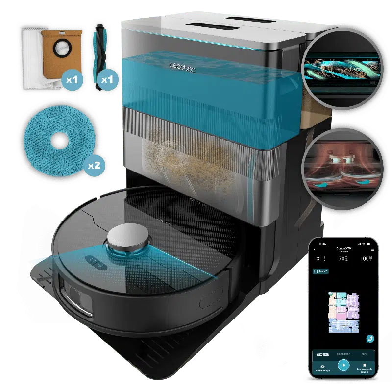 - Estación All-in Home con secado rápido. Mantenimiento completo para una limpieza impecable. La estación, escurre el agua sucia, lava las mopas y las seca con aire caliente. Además, olvídate del polvo y las alergias gracias a su sistema de autovaciado que vacía la bolsa higiénica automáticamente hasta por 12 semanas*. *El tiempo puede variar según las condiciones ambientales y hábitos de uso.