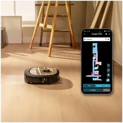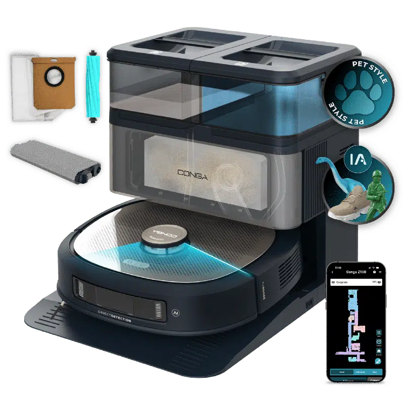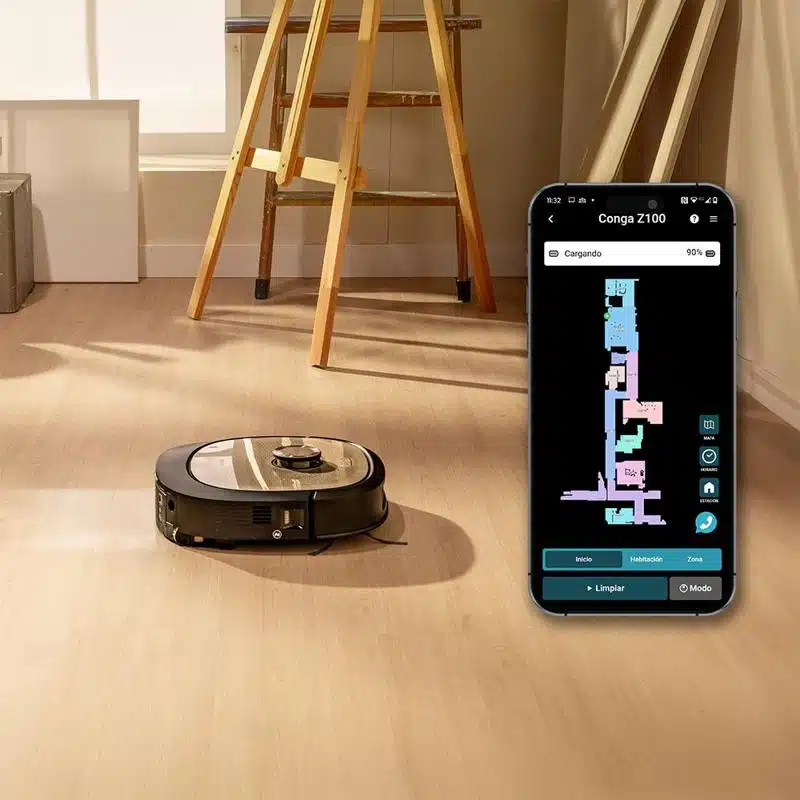 - AI con LaserEye. Con su Inteligencia Artificial y LaserEye navega con precisión incluso en entornos desordenados. Identifica objetos pequeños, suelos y suciedad. Conga toma las decisiones adecuadas para que tú no te preocupes por nada.
