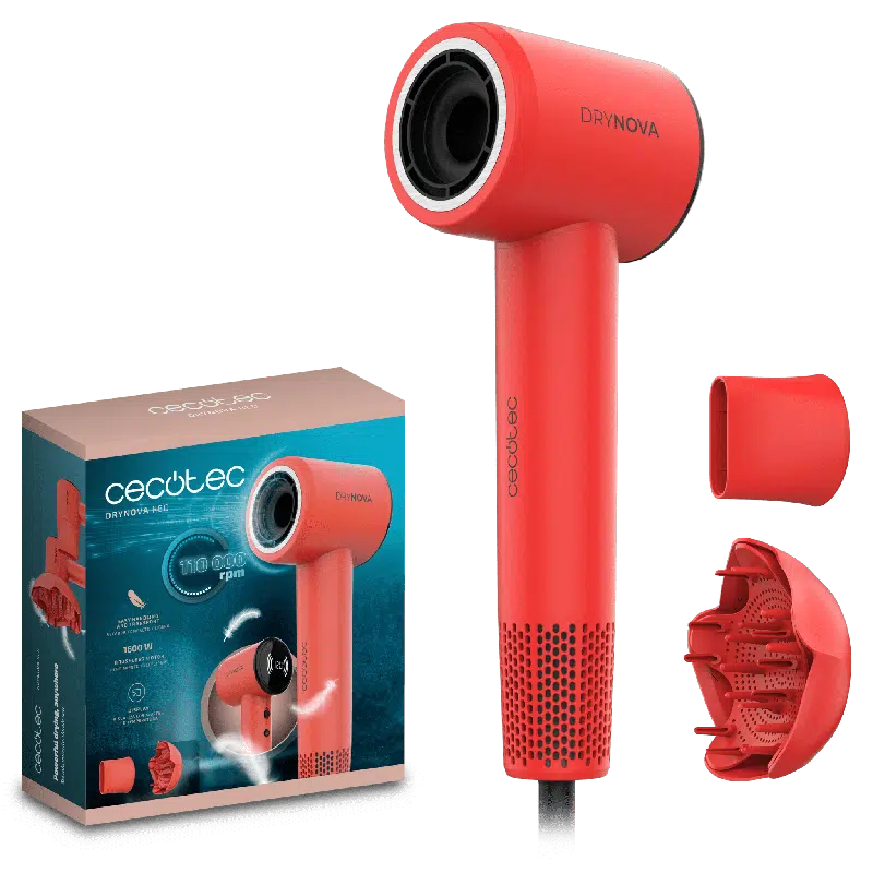 DryNova Red Secador de Pelo Brushless Compacto y Ligero con Potente Motor de 1600 W, 110,000 RPM, 2 accesorios, Silencioso y Duradero, con Generador de Iones y Múltiples Ajustes.