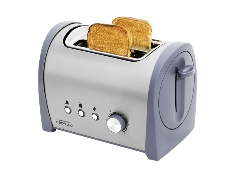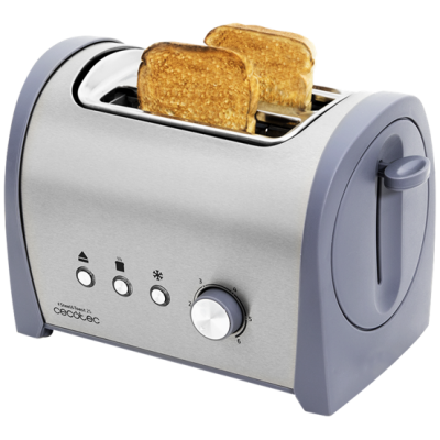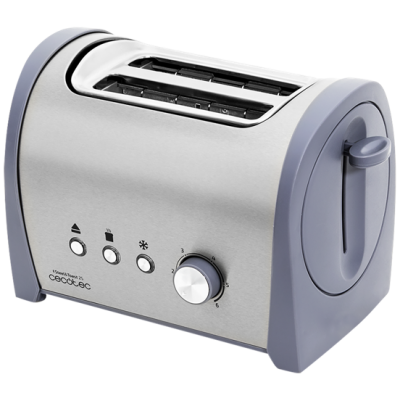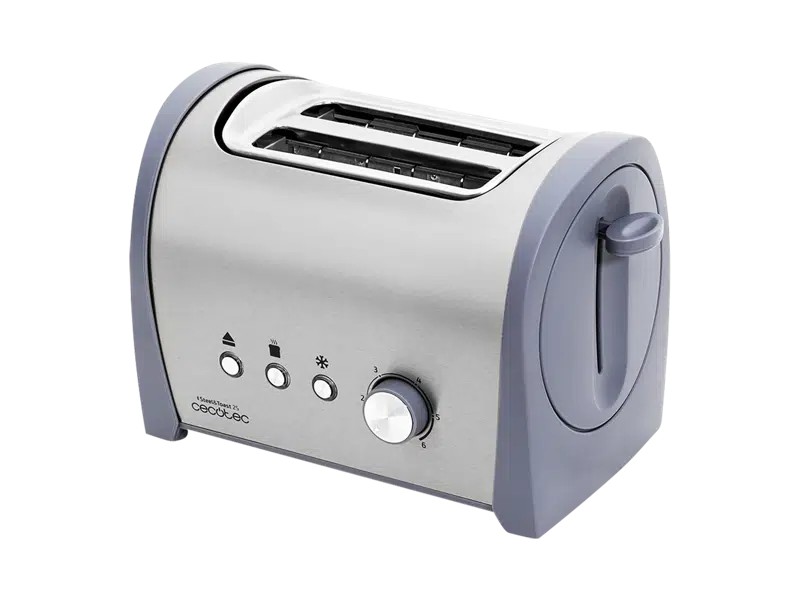 Tostadora de pan con capacidad para dos tostadas. Incluye soporte para panecillos. 800 W de potencia y 6 posiciones de tostado, función descongelar y función recalentar. Bandeja recogemigas amplia y hueco recogecables. Steel&Toast 2S de Cecotec.