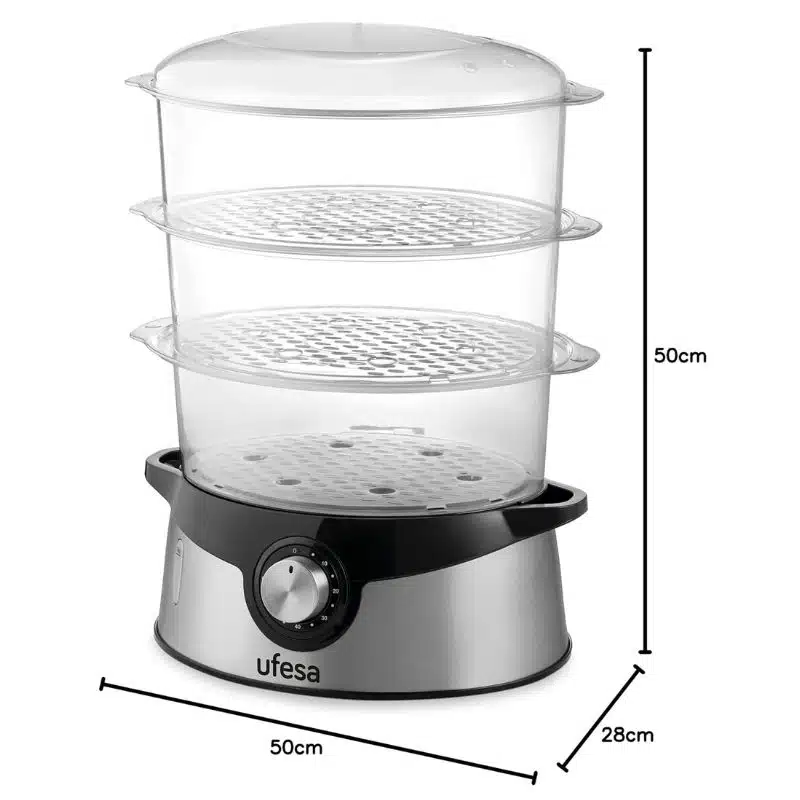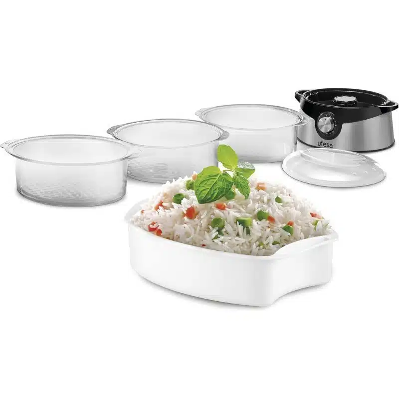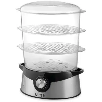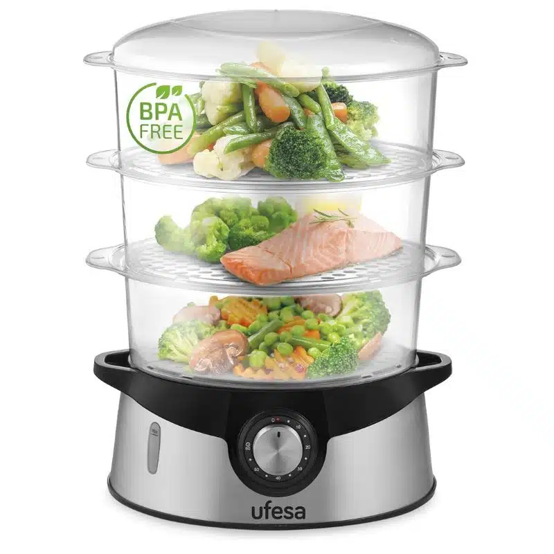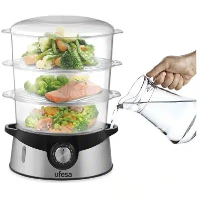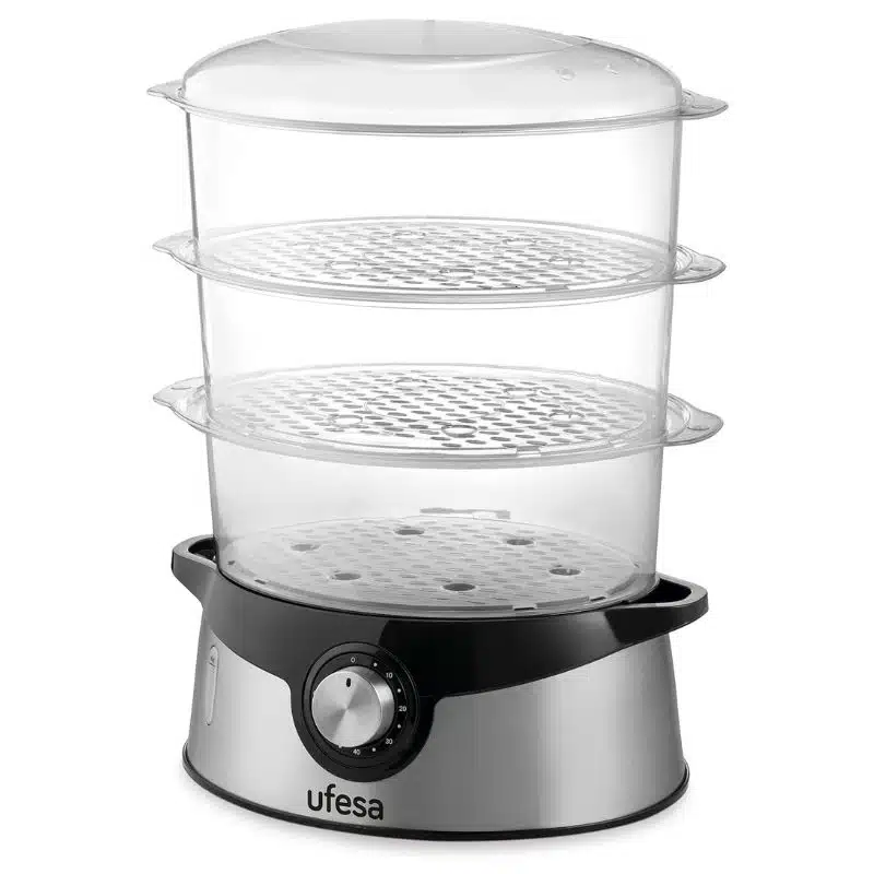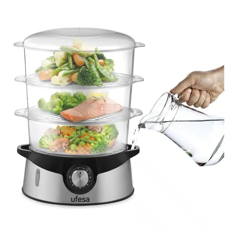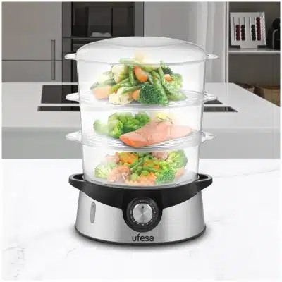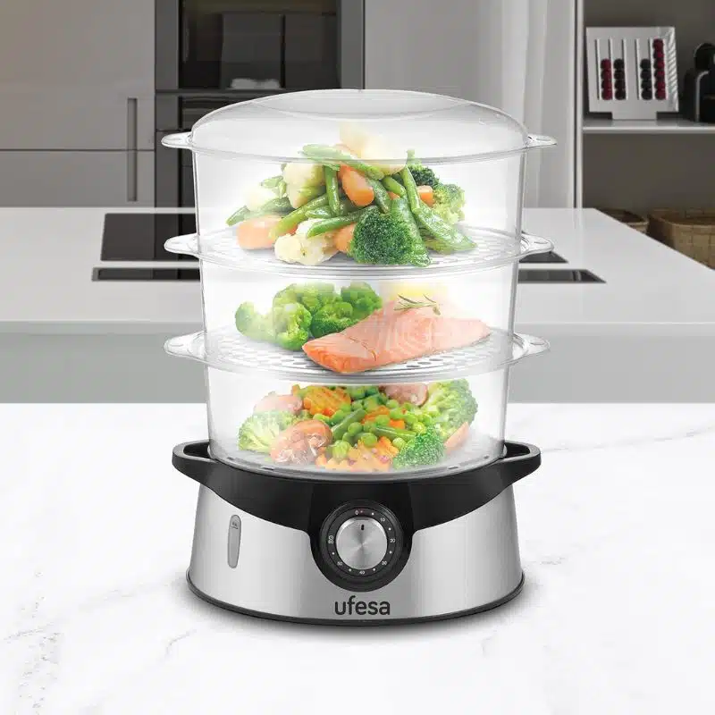 Dispone de tres bandejas apilables con una capacidad total de 9 litros, que te permiten cocinar hasta tres platos al mismo tiempo. Prepara verduras, pescado, arroz y mucho más en una sola cocción, ahorrando tiempo y energÃa.