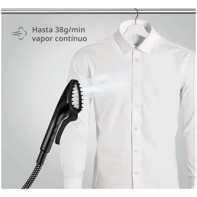 Gracias a sus 1580W de potencia, este vaporizador alcanza la temperatura óptima en aproximadamente un minuto, permitiéndote comenzar a trabajar casi de inmediato. Genera un vapor continuo de hasta 38 g/min, suficiente para penetrar en las fibras y alisar arrugas profundas con menos pasadas, refrescando además las prendas y ayudando a eliminar olores.