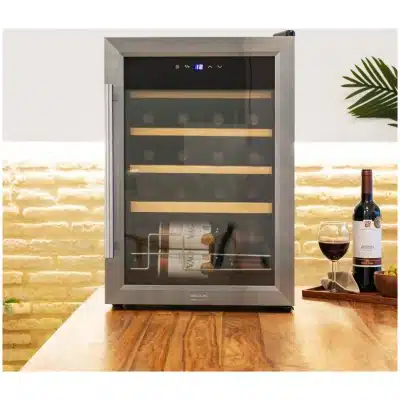- Funcionamiento silencioso y sin vibraciones. La vinoteca solo genera 39 dB de ruido lo que asegura un funcionamiento silencioso y sin vibraciones, para que puedas situarla en cualquier estancia sin que te moleste.