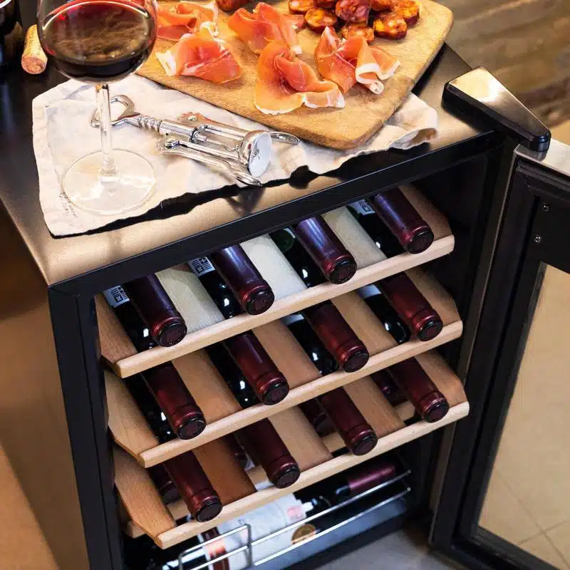 - Alto rendimiento. Nuestra vinoteca incorpora un compresor que garantiza un bajo nivel sonoro y un alto rendimiento, para que tus vinos siempre se mantengan en el mejor de los estados.