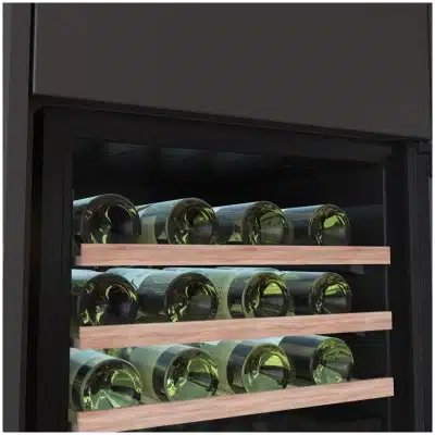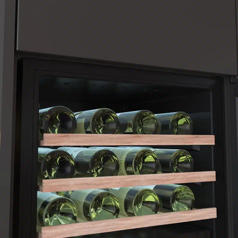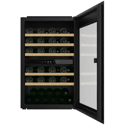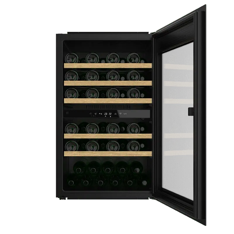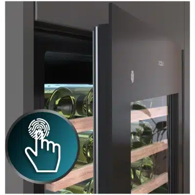 Bolero GrandSommelier Duo 57000 Touch Black Compressor Vinoteca integrable negra con doble zona y sensor de apertura Touch con capacidad para 57 botellas en 5 baldas de madera y 88,5 cm de alto por 59 cm de ancho. Sistema compresor de enfriamiento muy silencioso (38dB) y refrigerado por gas respetuoso con el medio ambiente (R600a). Luz LED y panel de control tรกctil LED interiores.