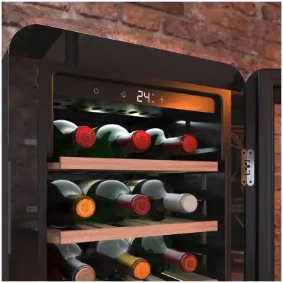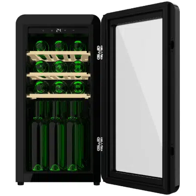 Bolero GrandSommelier Origin 18 Hit Black Vinoteca de diseño retro color negro, Capacidad para 18 botellas, Control electrónico de temperatura mediante display LED, Rango ajustable de 5 a 20ºC, Compresor Integrado, TecnologÃa NoFrost, Estantes de madera, Luz interior, Ventilación interna asistida por ventilador, Dimensiones de Alto 74,3cm, Ancho 36,6cm, Fondo 47,6cm.