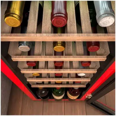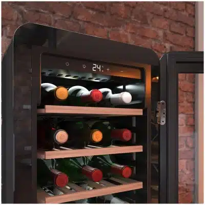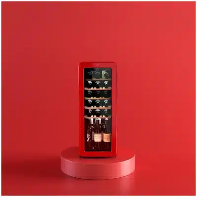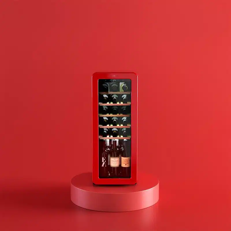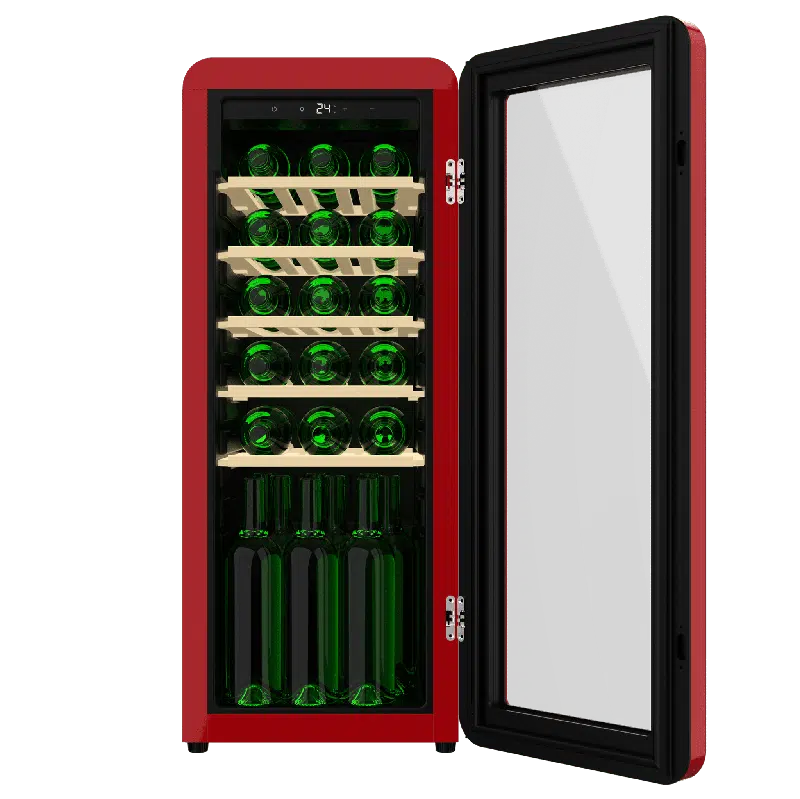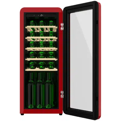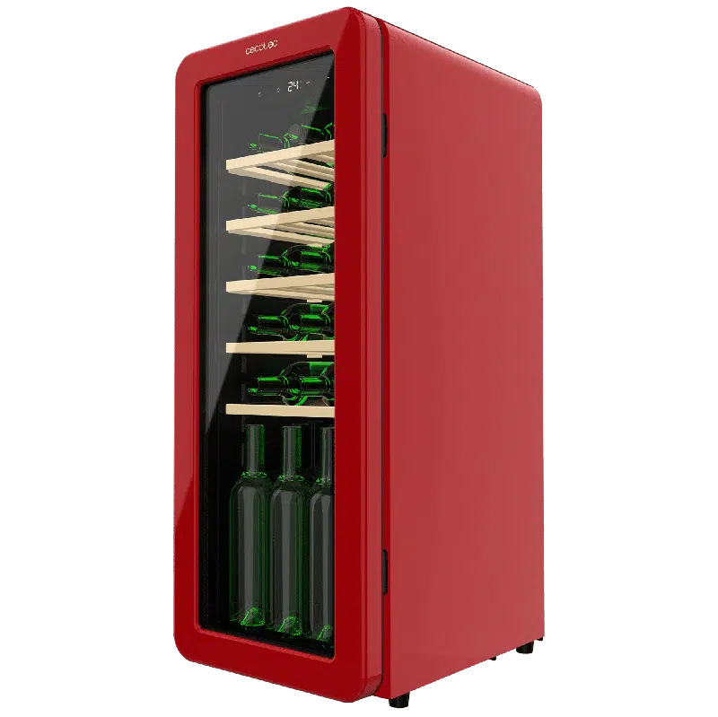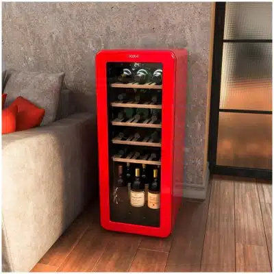 Bolero GrandSommelier Origin 24 Hit Red Vinoteca de diseño retro color rojo, Capacidad para 24 botellas, Control electrónico de temperatura mediante display LED, Rango ajustable de 5 a 20ºC, Tecnología NoFrost, Estantes madera, Luz interior, Ventilación interna asistida por ventilador, Dimensiones de Alto 92,8cm, Ancho 36,6cm, Fondo 47,6cm.